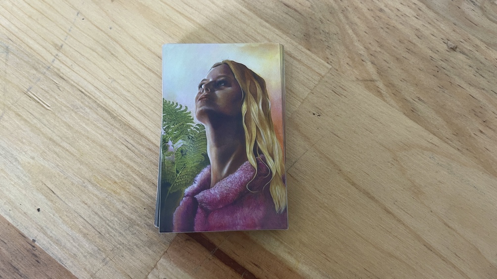 Holographic Mini Print Sticker of original oil painting Sara/Ophelia (2021). Sticker is about 2" x 3"
